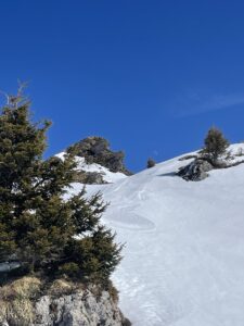 En una de las exploraciones de las diferentes zonas, nos aventuramos a la entrada de uno de los itinerarios marcados en el mapa. Los itinerarios son zonas fuera de pista, controladas de avalanchas y balizadas a los lados, pero sin supervisión ni zonas pisadas. Básicamente te aventuras en el terreno y bajas fuera de pista por donde puedas/quieras y si te quedas vendido pues a buscártelas o esperar a que alguien pase que te eche una mano.