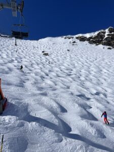 En la base del Mont Fort decidimos bajar para calentar haciendo pistas rojas y ya empezamos a movernos. La nieve está mucho mejor que en Châtel o Avoriaz, hay más polvo y no hay zonas duras. Hay algunas pistas no pisadas con bañeras, como la negra que baja de Mont Fort, pero no tantas como en Avoriaz.