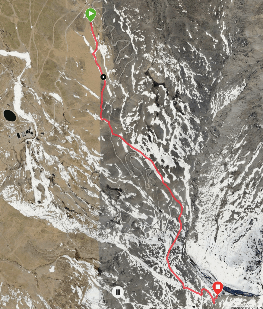 Cuando ya llego a Borreguiles, están las máquinas moviendo nieve y ya es un poco más de negociar por donde ir, más que disfrutar bajando. Al poco engancho con el carril y toca patear de vuelta (otros 40 minutos al parking).