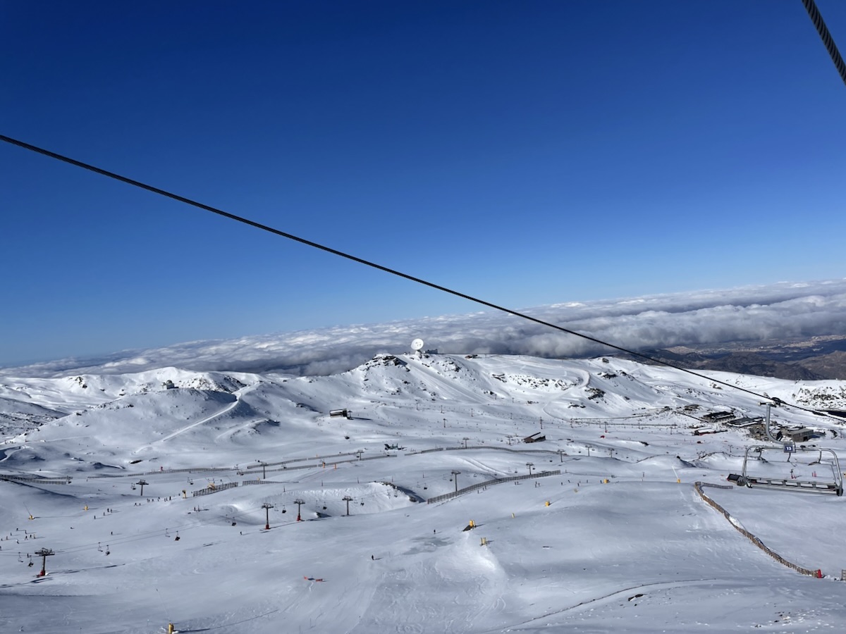 Hoy me aventuro al Veleta a ver si lo pillo en hueco de buena visibilidad, pero no hay suerte. A esquiar con los pies que toca. Pero lo disfruto muchísimo. Hago una bajada por la primera pala de la Panorámica sin visibilidad ninguna, en paralelo corto practicando acentuar mucho la flexión-extensión e «hincar el cuchillo en el pan» para controlar la velocidad. La segunda pala ya se abre y permite clavarle al carving viendo un poquito más.