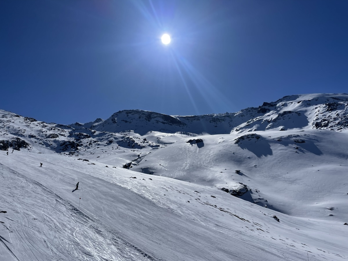 Muy curioso es que aquí no pisan ciertas zonas y están todas llenas de bañeras a propósito, aún pistas azules. Sorprende mucho ver a los niños chicos bajando por bañeras y los profesores metiéndolos por fuera de pista… es la cultura de la nieve que no se ve tanto en nuestra Sierra. Lo otro muy curioso es que siempre hay azules y rojas que bajan desde lo alto. Las rojas son las pistas verdaderas que bajan de los picos y las azules son los carriles auxiliares que han hecho para bajar si no puedes hacer las rojas. ¡Accesibilidad!
