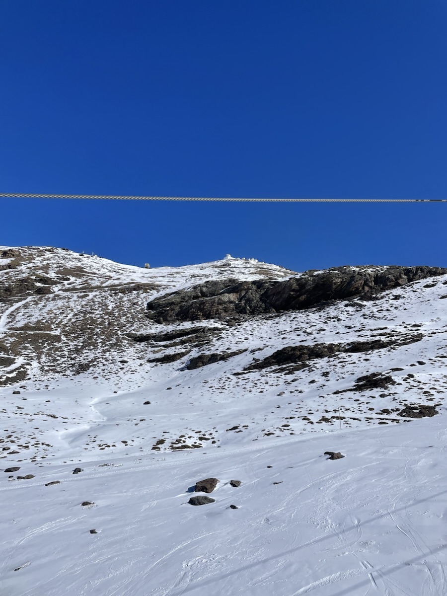 Nada más subir ya vemos que aquello es otro nivel. Un montón de freeriders subiendo, gente con arneses y mosquetones, equipos de montaña… definitivamente un público mucho más fuera de pista que las otras estaciones. Las vistas arriba son otro espectáculo.